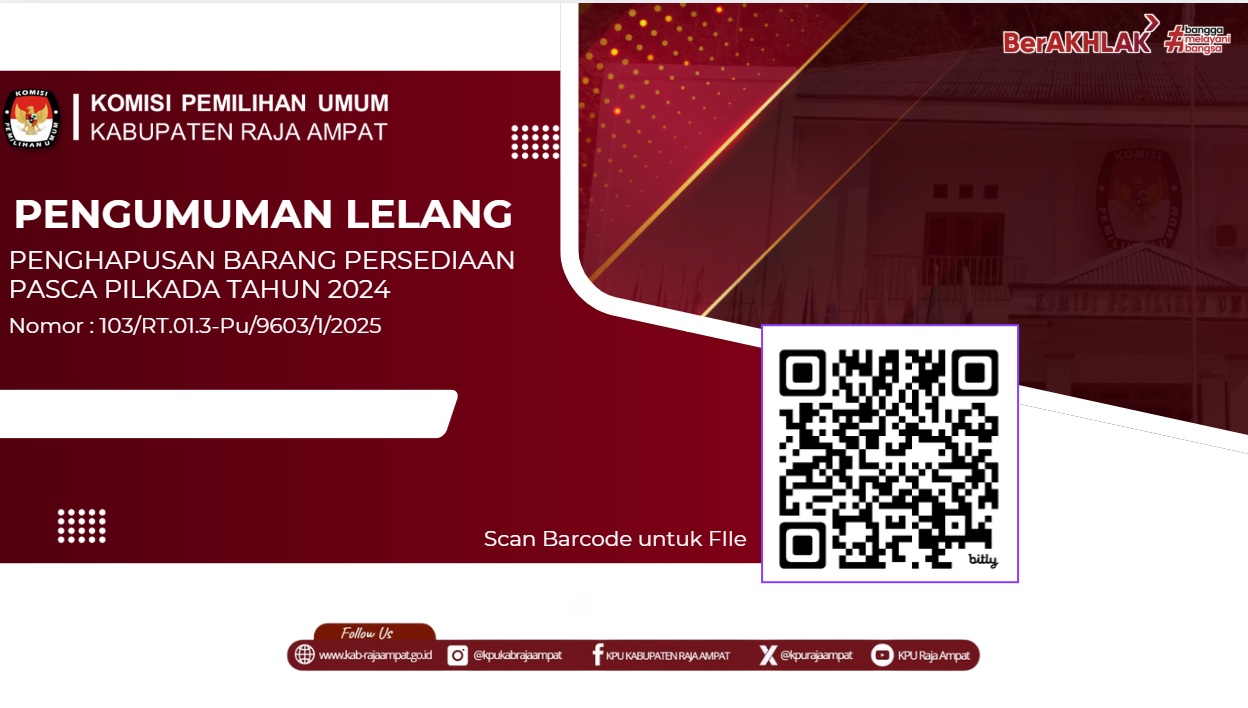 PENGUMUMAN LELANG PENGHAPUSAN BARANG PERSEDIAAN PASCA PILKADA 2024 Kamis, 02 Oktober 2025 18:40 22 Bagikan: Telah dilihat 22 kali