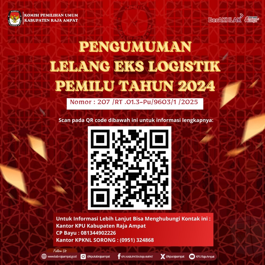 PENGUMUMAN LELANG EKS LOGISTIK PEMILU TAHUN 2024 Kamis, 13 November 2025 08:58 79 Pengumuman Lelang EKS LOGISTIK Pemilu 2024. untuk File Pengumuman Bisa Di Scan pada Barcode yang sudah Disediakan. #Kpumelayani Bagikan: Telah dilihat 79 kali