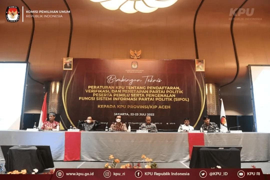 #TemanPemilih, Ketua KPU RI Hasyim Asy'ari, Anggota KPU RI August Mellaz, Idham Holik, Yulianto Sudrajat dan Parsadaan Harahap didampingi Deputi Bidang Dukungan Teknis Eberta Kawima membuka Bimbingan Teknis ( Bimtek) Peraturan KPU tentang Pendaftaran, Verifikasi dan Penetapan Partai Politik Peserta Pemilu serta Pengenalan Fungsi Sistem Informasi Partai Politik (SIPOL) kepada KPU Provinsi/KIP Aceh se-Indonesia , Jumat (23/7).