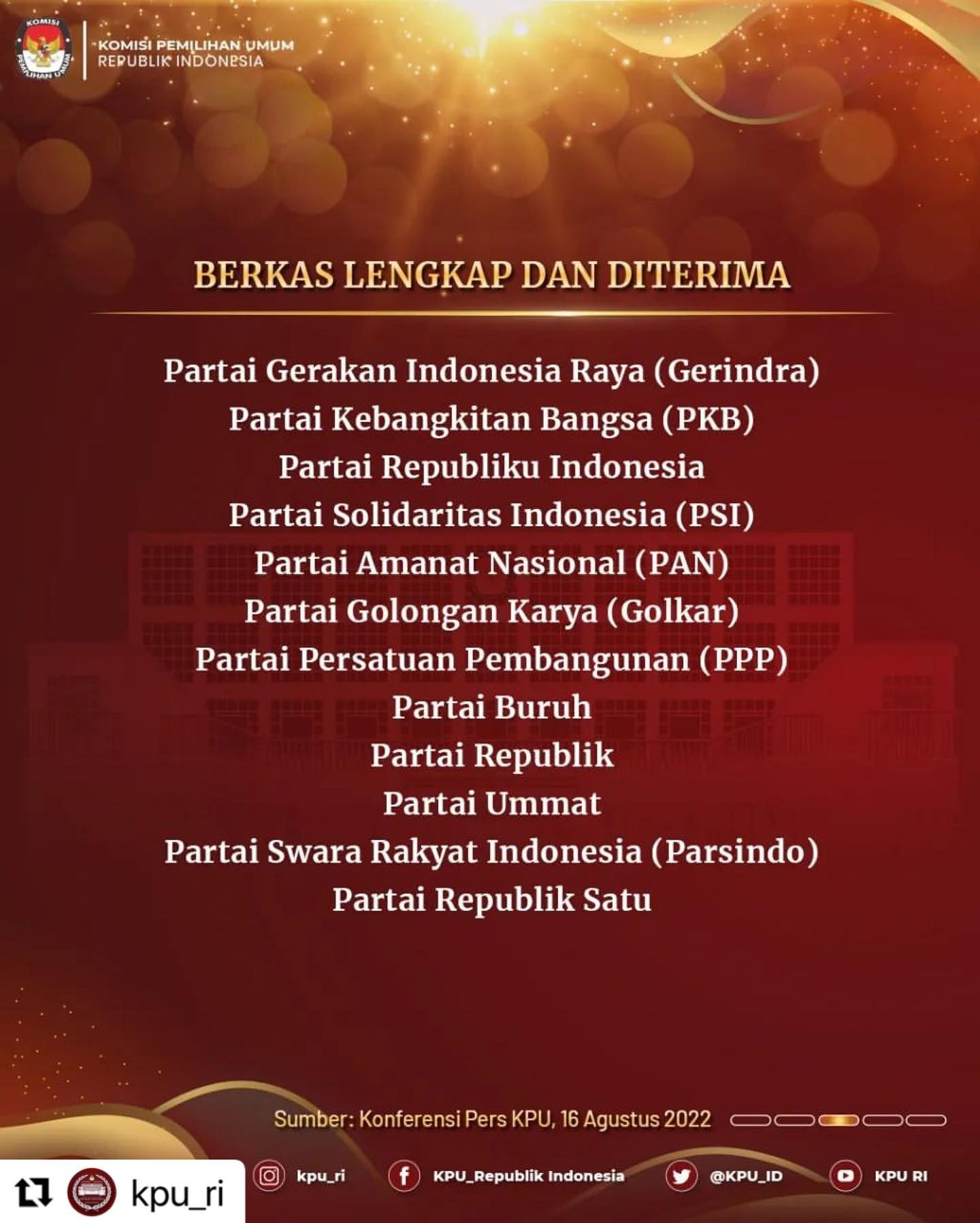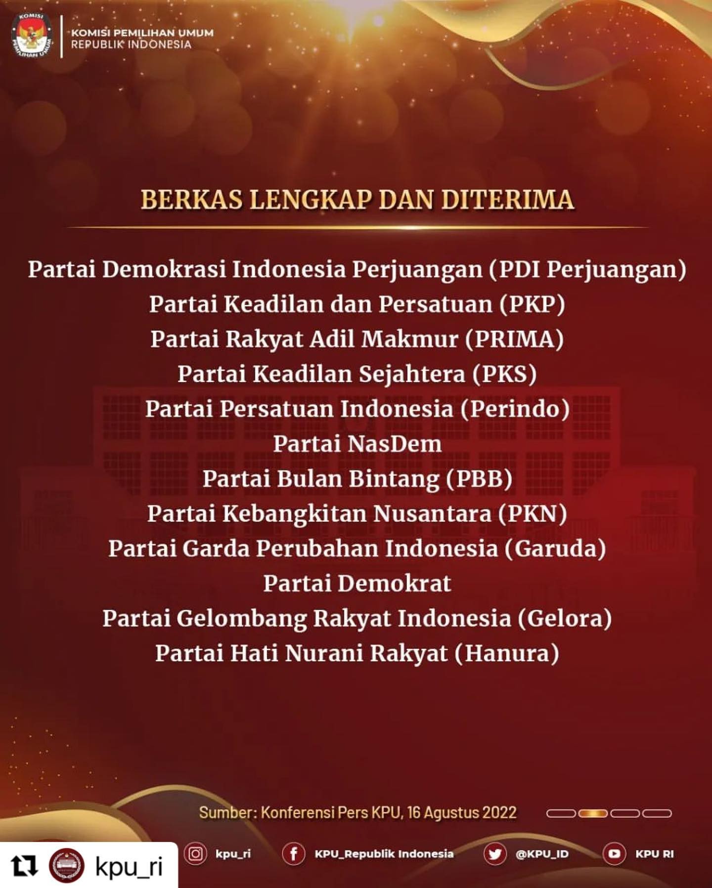 INFO DAFTAR PARPOL YANG BERKASNYA DI NYATAKAN TELAH LENGKAP DAN DITERIMA SEBAGAI CALON PESERTA PEMILU 2024