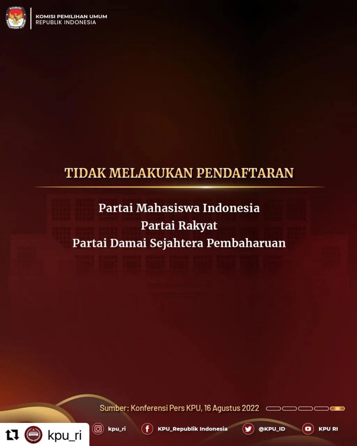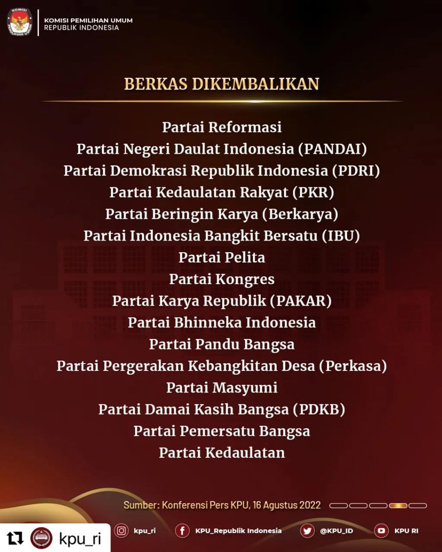 #TemanPemilih, kamu perlu tahu, inilah 24 partai politik yang berkas pendaftarannya sudah lengkap sebagai calon Peserta Pemilu 2024 dan 16 partai politik yang berkas pendaftarannya dikembalikan serta 3 partai politik yang tidak melakukan pendaftaran,