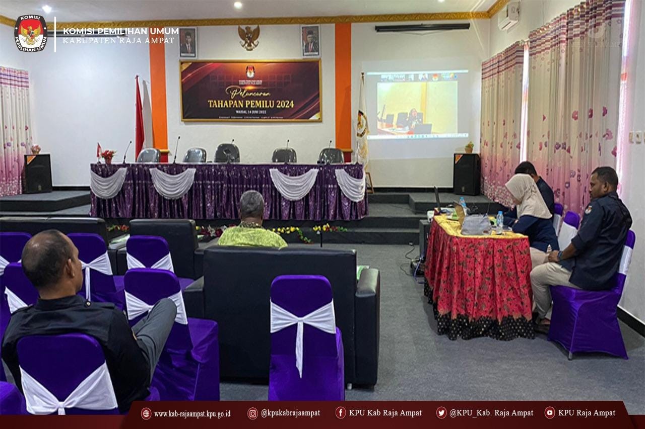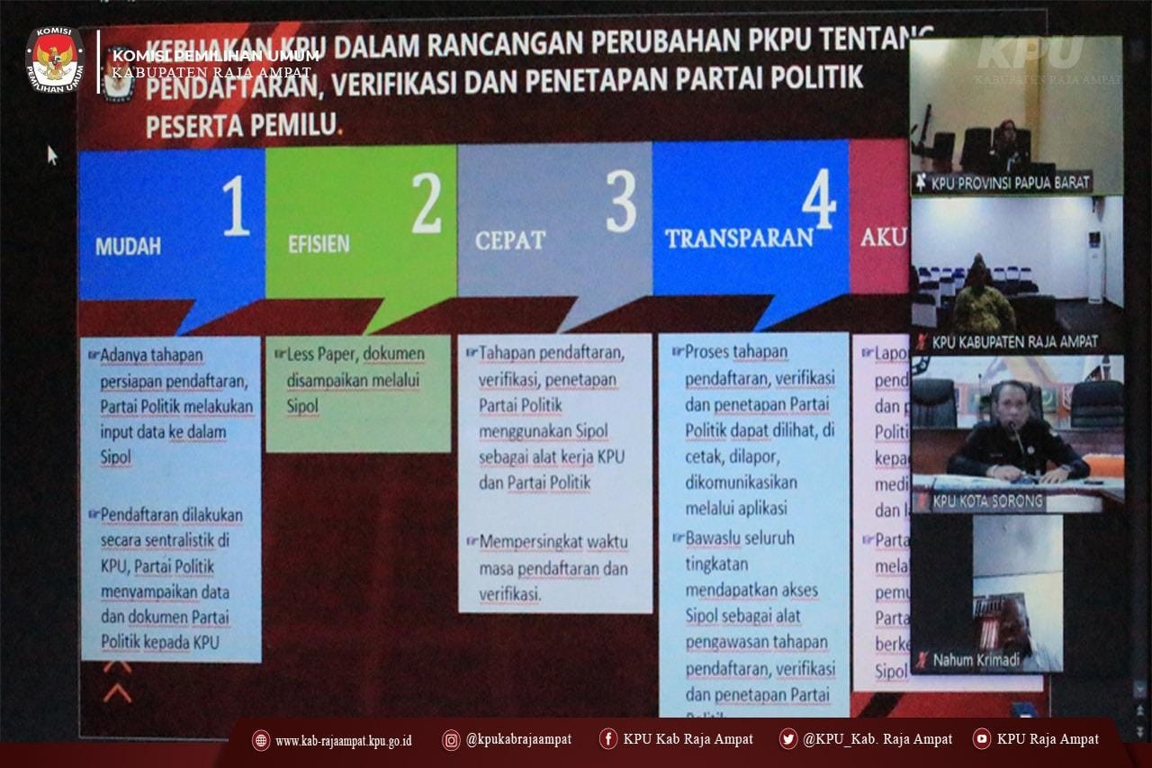 PELUNCURAN TAHAPAN PEMILU 2024 Kamis, 30 Juni 2022 09:19 357 #TemanPemilih, KPU Kabupaten Raja Ampat mengikuti Rapat koordinasi verifikasi partai politik dan penyampaian hasil Rapim yang diselenggarakan KPU Provinsi Papua Barat. Selasa (28/06/2022) Rakoor di buka oleh Ketua KPU Provinsi Papua Barat Paskalis Semunya, S.Sos Kemudian dilanjutkan dengan pemaparan materi oleh Anggota KPU Papua Barat Divisi Teknis Penyelenggara Fatmawati, S.Pd.I yang menekankan tentang pentingnya tertib administrasi ketika melaksanakan tahapan verifikasi administrasi dan faktual. Hadir mengikuti Rakor tersebut Ketua KPU Kabupaten Raja Ampat Steven Eibe, Divisi Teknis Penyelenggara Herdhi F Rumbewas, Kasubbag Teknis dan Humas Irpawati serta Staf Sekretariatan. Rakoor di gelar melalui media zoom dan di ikuti 13 KPU Kabupaten/Kota se Papua Barat. #KPUMelayani #PemiluSerentak2024 #Integritas24Jam Bagikan: Telah dilihat 357 kali