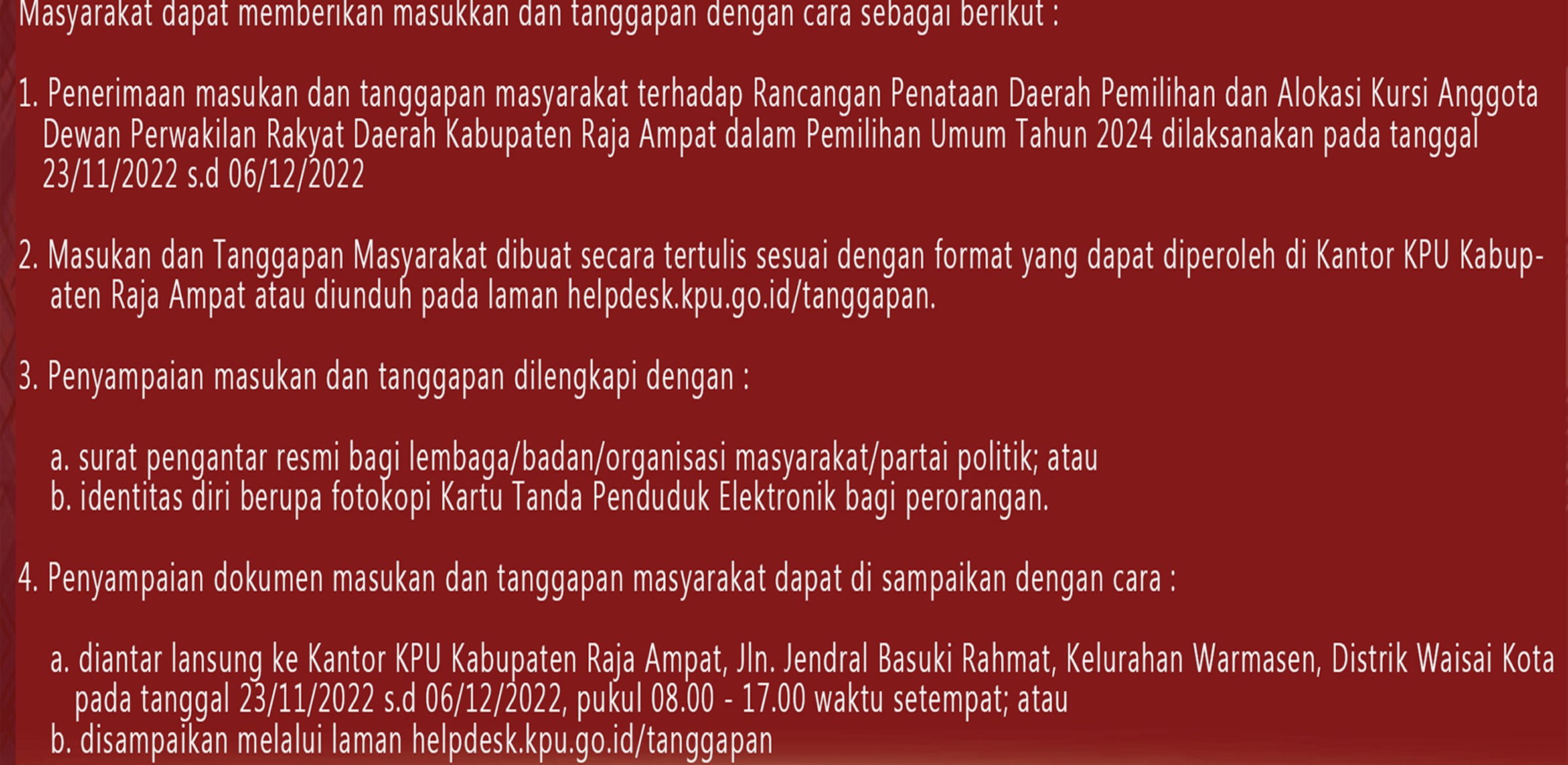Pengumuman Rancangan Penataan Daerah Pemilihan dan Alokasi Kursi Anggota Dewan Perwakilan Rakyat Daerah Kabupaten Raja Ampat dalam Pemilihan Umum Tahun 2024