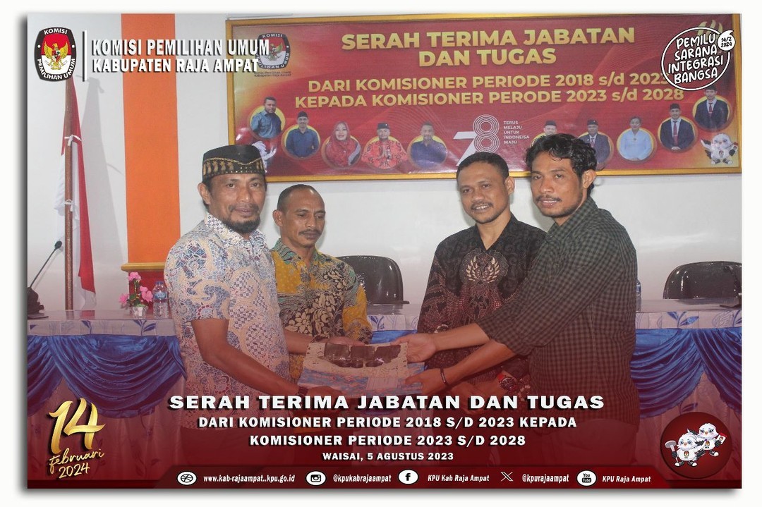 #TemanPemilih, Pada Hari ini Sabtu tanggal 5 Agustus 2023, bertempat di aula Kantor KPU Kabupaten Raja Ampat, Jalan Basuki Rahmat , Kelurahan Warmasen , Distrik Kota Waisai, Kabupaten Raja Ampat, Provinsi Papua Barat Daya, telah dilaksanakan Serah Terima Jabatan dan Tugas dari Komisioner Periode 2018 s/d 2023 kepada Komisioner Periode 2023 s/d 2028.
