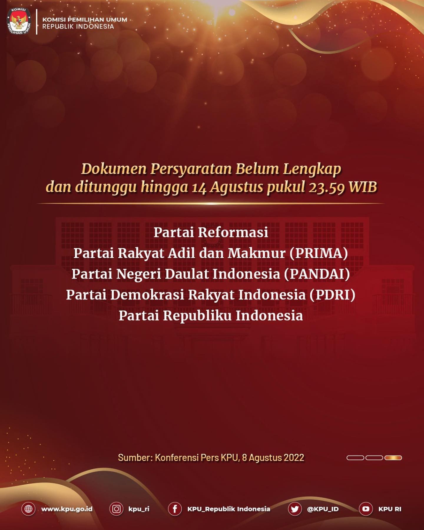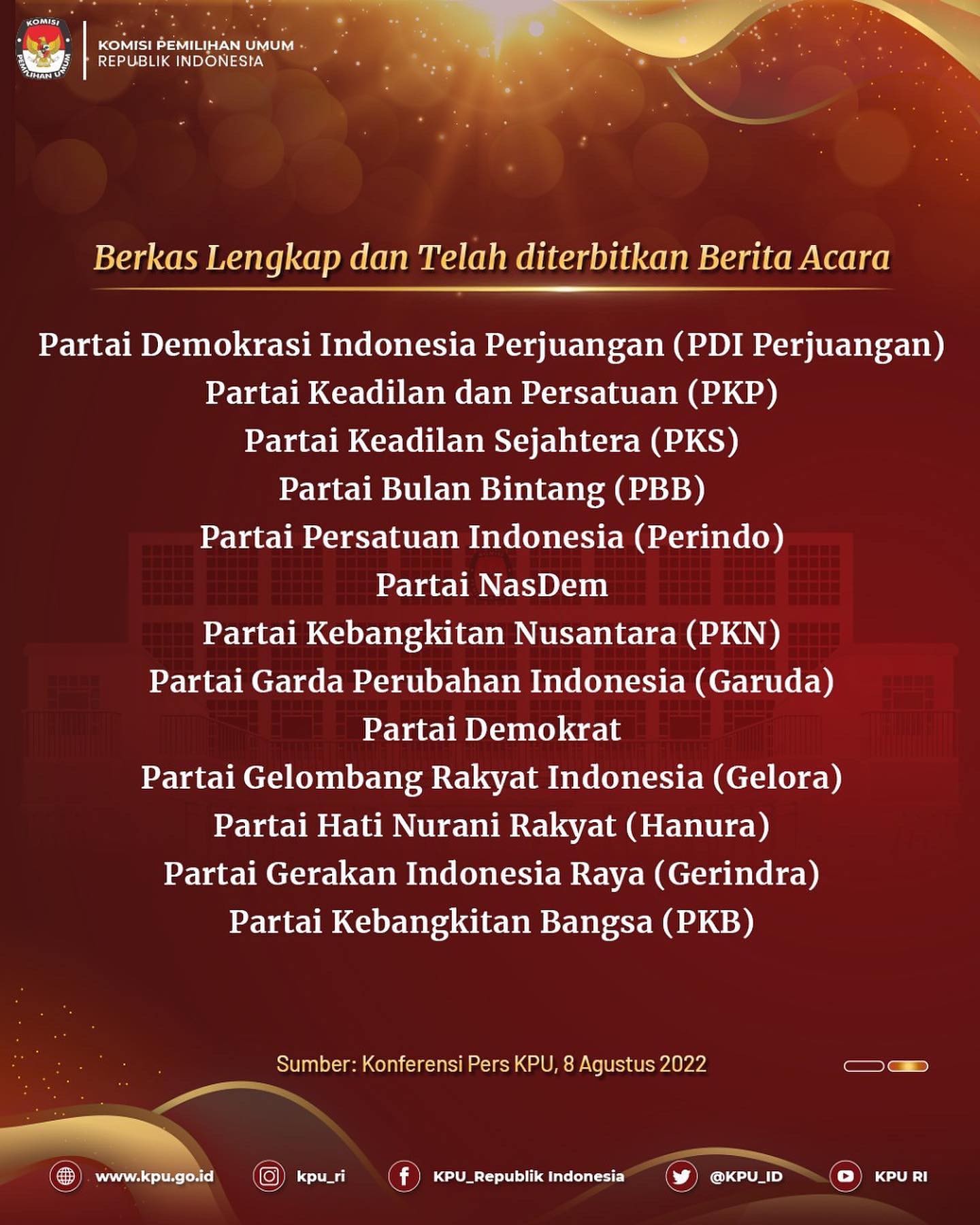 #TemanPemilih, kamu perlu tahu, inilah 13 partai politik yang berkas pendaftarannya sudah lengkap sebagai calon Peserta Pemilu 2024 dan 5 partai politik yang sedang dalam tahap melengkapi berkas hingga 14 Agustus 2022,