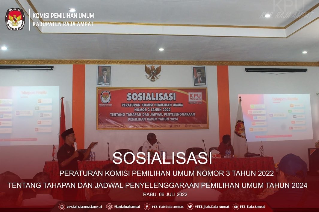 #TemanPemilih, Komisi Pemilihan Umum (KPU) Kabupaten Raja Ampat menggelar sosialisasi Peraturan KPU Nomor 3 Tahun 2022 tentang Tahapan dan Jadwal Penyelenggaraan Pemilihan Umum Tahun 2024 yang dilaksanakan di Aula Kantor KPU Raja Ampat, Rabu (06/07/2022).
