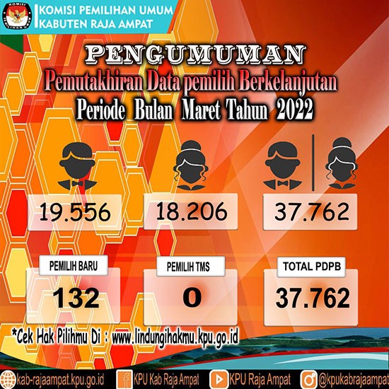 Bagi Warga Kabupaten Raja Ampat yang belum terdaftar sebagai Pemilih, Mengalami Perubahan Identitas Kependudukan, Masuk Pemilih Pemula ( Berusia 17 Tahun ) atau Keluarga yang Sudah Meninggal dunia.