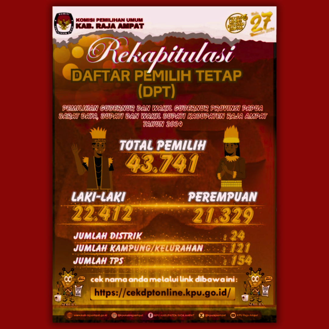 #Temanpemilih Berikut kami informasikan hasil Reakpitulasi Daftar Pemilih Tetap (DPT). Pada Pemilihan Gubernur dan Wakil Gubernur Provinsi Papua Barat Daya, Serta Bupati dan Wakil Bupati Kabupaten Raja Ampat Tahun 2024. (19/9/2024)